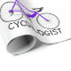 Bicicleta roxa com texto em preto no CYCOLGIST sobre fundo branco. A cor de fundo pode ser alterada.
