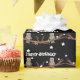 Este rolo de papel embrulhado é preto coberto por estrelas brancas com bonito corujas marrons sentados em ramos de árvores vestindo colares de cristal roxo. personalize o texto Feliz de Aniversário com o modelo.