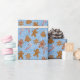 Biscoitos de pão de Natal e canetas doces em fundo azul claro.