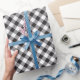 Black and white buffalo plaid wrapping paper featuring a black and white checkered pattern.