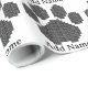 A pata do cão de desenho impresso a preto. Blocos que formam uma pata de cão com efeito 3D. Rolos de papel de embrulho de presente personalizados. Bom para decoração. Editar nome para personalizar. Ideia de presente para amantes de cães.