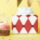 Impressão de harlequin preto e vermelho com pontos pretos.