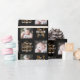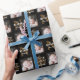 Christmas gift wrapping paper feature modern calligraphy merry Christmas and happy new year, family name typography, with personalized two photos in black, gold and white.