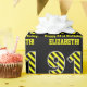 Este design de papel empacotado ousado, atencioso, com tema de aniversário apresenta um grande número "91", com um padrão listrado preto e amarelo. Também apresenta a mensagem "Feliz aniversário de 91ruas", e um nome personalizado. O fundo é preto colorido. Esfregar papel como este pode ser uma maneira divertida de embrulhar um presente de aniversário ou um presente dado a alguém que está comemorando seu 90º aniversário. [~Z0000381]