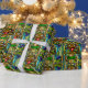A pintura digital original neste papel de embrulho é certamente uma risada para crianças de todas as idades! Contra um pano de fundo colorido de fitas ondulantes, um nativo da ilha irreverente se esticando pela língua e balançando os ouvidos enquanto ele 'explode suas framboesas' enquanto dois amigos monstros amistosos em forma de bola o animam. Para aniversários, Natal, sempre.