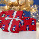 Um papel de embrulho, com um bonitinho bonitinho, vestido com um chapéu de veludo azul e colete, cercado por estrelas azuis sobre fundo vermelho para o Natal.