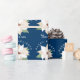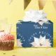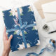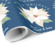Este papel de embrulho de presente de Natal apresenta um padrão de poinsettia branca desenhado à mão sobre um fundo azul escuro. Texto curvo, no topo lê: Felizes Feriados. O texto personalizado, na parte inferior, permite adicionar seu nome.