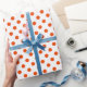 Um papel de embalagem construído com um padrão de bolinhas laranja brilhante com uma distância média entre os pontos sobre um fundo branco. Personalize o fundo branco entre outras opções.