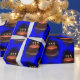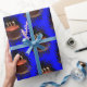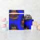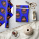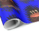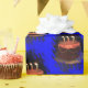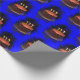 Uma fotografia de um Livro de Bolo de Aniversário brilhante e colorido. Com uma moldura azul em volta de um Bolo com três velas flamejantes. Isso é no Wrapping PAPER.