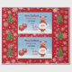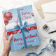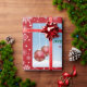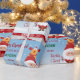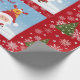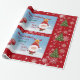 Bonita, engraçada e elegante papel de embrulho de Natal com Papais noeis em sua fantasia vermelha (segurando uma cana doce) e sua rena favorita, Rudolph, atrás dele. O texto diz "Feliz Natal! Este presente é para Jayden do Papai Noel" — certifique-se de personalizar o nome do garoto. Você também pode mudar a saudação, se quiser. A design também inclui duas bolhas vermelhas com flocos de neve e uma paisagem nevada, em meio a uma cena de inverno com flocos de neve e árvores de Natal com bolhas prateadas sobre fundo vermelho.