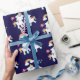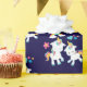 Papel de embrulho padronizado com 2 unicórnios dançantes bonitos com caudas brilhantes e coloridas, e mano. Um arco-íris colorido com nuvens em cada lado acima de suas cabeças. Outros elementos incluem uma pequena flor, um coração e algumas estrelas. Fundo roxo escuro.