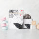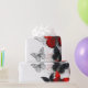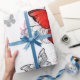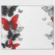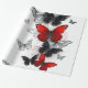 Bando de borboletas voadoras, realistas, vermelhas e pretas em fundo branco com gotas de tinta.
