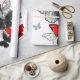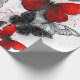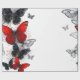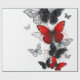 Bando de borboletas voadoras, realistas, vermelhas e pretas em fundo branco com gotas de tinta.