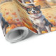 Uma pintura em forma de aquarela de um cão alegre sentado em meio a uma pilha de folhas vibrantes de queda, cercado por pequenas abóboras e bolotas espalhadas. O cachorro veste um chapéu de peregrino e fede de alegria, capturando o espírito da Ação de Graças. No fundo, campos de colheita suaves e árvores abrigadas em ouro criam um ambiente rural pacífico. Texturas gentis e tons de outono aquecidos dão à cena uma sensação acolhedora e nostálgica de celebrar a beleza da estação.