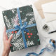 Galhos de abetos brancos e estrelas douradas, bolinhas azuis e névoas vermelhas sobre fundo preto. Modelo de papel de embalagem personalizável