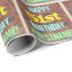 Este divertido design de papel de embrulho com tema de aniversário apresenta uma mensagem como "FELIZ 51ruas ANIVERSÁRIO, NOME PRÓPRIO!", onde o nome pode ser personalizado. O fundo apresenta uma representação de uma parede de tijolos constituída por alguns tijolos de cor castanha avermelhada. O texto de mensagem personalizável apresenta cores como azul, amarelo e verde, e tem uma aparência inspirada pela do grafite pintado. Um papel de embrulho como este poderia talvez ser usado para embrulhar presentes de aniversário que são dados a alguém que comemora seus cinquenta anos de primeiro ano. [~Z0000274]