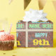 Este divertido design de papel embrulhado com tema de aniversário apresenta uma mensagem como "FELIZ 9º ANIVERSÁRIO, NOME AQUI!", onde o nome pode ser personalizado. O fundo apresenta uma representação de uma parede de tijolos constituída por alguns tijolos de cor castanha avermelhada. O texto de mensagem personalizável apresenta cores como azul, amarelo e verde, e tem uma aparência inspirada pela do grafite pintado. Um papel de embrulho como este poderia talvez ser usado no embrulho de presentes de aniversário que estão sendo dados a alguém que está comemorando seu nono aniversário. [~Z0000274]
