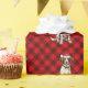 Uma ilustração adorável com aquarela de um cão espanhol Brittany, pares com um fundo de xadrez de búfalos vermelho divertido, e o cão veste um lindo chapéu de Papai Noel.