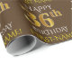 Este design de papel de embrulho apresenta uma mensagem como "FELIZ 36º ANIVERSÁRIO", com o "36º" a ter uma aparência falsa/imitação de ouro. Ele também apresenta um nome que pode ser personalizado e um fundo castanho. Talvez possa ser utilizado quando se dá presentes para o trigésimo sexto aniversário de alguém. [~Z0000133]
