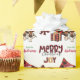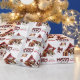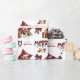O padrão repetido neste belo papel de embrulho de Natal é uma imagem de um adorável filhote de Cachorro Basset vestindo um chapéu de Papai Noel vermelho e branco, com um travesseiro de xadrez de búfalo preto e vermelho atrás dele, e um pacote de presentes coordenado com uma fita de ouro ao seu lado. Há também um arco de xadrez de búfalos e o texto correspondente que diz "JOY". O texto de xadrez de búfalos vermelho e preto estilizado diz MERRY CHRISTMAS", e sua própria assinatura está em dois campos para você personalizar.