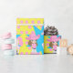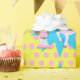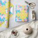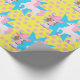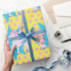 Pequena vaquinha de cabelo castanho e impressão cor-de-rosa com papel de embrulho de presente de bolinhas rosa e amarelo.