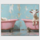 Uma pintura branca com uma cabra branca com chifres relaxando numa banheira rosa vintage, colocada contra uma parede azul clara para uma encantadora e divertida cena rústica.