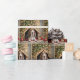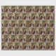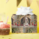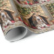 Um cesto-bastião senta-se contente numa casa-doghouse aconchegante de madeira adornada com luzes festivas, enquanto no fundo uma árvore de Natal brilha com ornamentos estrelados