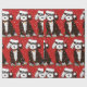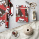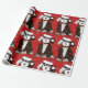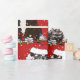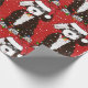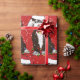 Cartoon Preto e Branco Festivo Personalizado Bernedoodle Puppy vestindo "Esta é a estação" chapéu de Santa, arco vermelho com sinos, enredado em luzes de natal. Fundo de neve. Papel de embrulho de natal vermelho para amantes de berneodle!