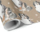 Um papel de embrulho de férias em kraft, com cães da Montanha Bernesa pintados a aquarelas, com luz caindo neve em um padrão repetido.