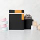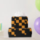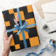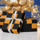 Uma bela caixa de presentes de Natal embrulhada adornada com um arco vermelho vibrante, colocada contra um pano de fundo festivo de galhos de pinus verdes, pinecones e ornamentos coloridos. O único papel de embrulho preto e laranja, que marca a cor, acrescenta uma reviravolta moderna a esta tradicional cena natalícia, perfeita para doar durante a época festiva.