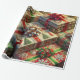 A cena retrata um arranjo de caixas de presentes de Natal embrulhadas em papel festivo e atordoante. O papel de embrulho apresenta designs intrincados como flocos de neve, folhas ocas, canas doces e árvores de Natal, rendidos em cores vibrantes como vermelho, verde, ouro e branco. Cada caixa brilha com um acabamento brilhante ou metálico, refletindo luz suave e quente para melhorar seu apelo festivo. Os presentes são amarrados elegantemente com fitas luxuosas e arcos que combinam ou complementam o papel de embrulho. O fundo sugere uma atmosfera de férias acolhedora, com luzes cintilantes quentes, uma árvore de Natal, e decorações sazonais acrescentando ao encanto.