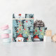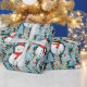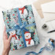 O plástico de Natal com homens de neve em lenços vermelhos quentes e um bonito fundo de pinheiro azul.