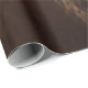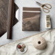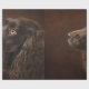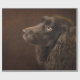 Design apresenta um retrato fotográfico de um cão com cabelo castanho sobre fundo castanho escuro.