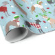 Cães de Natal bonitos em roupas festivas de férias. Os galgos italianos com muitas cores casaco vestem chapéus de Santa, galhadas, suéteres em fundo vermelho, rosa e azul claro com ornamentos espalhados em papel embrulhado.