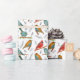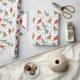 Um papel de embrulho com uma variedade de aves desenhadas em caneta e tinta com aquarela. Os pássaros incluem cardeais, galinhas, caçadores e pássaros azuis.