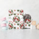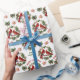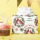 O padrão repetido neste papel de embrulho de Natal inclui uma imagem de duas aves cardeal vermelhas poleiradas em uma coroa de morango vermelho. O texto curvo vermelho diz "Feliz Natal" no topo da coroa, com sua assinatura personalizada em verde abaixo dela. Outras imagens incluídas no padrão incluem arcos festivos e estrelas decorativas.
