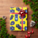 Legal presente embrulhado impresso por toda a parte com um padrão desenhado à mão de carros de corrida de brinquedos azuis e capacetes de choque num fundo amarelo brilhante