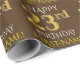 Este design de papel de embrulho apresenta uma mensagem como "FELIZ 23º ANIVERSÁRIO", com o "23º" a ter uma aparência falsa/imitação de ouro. Ele também apresenta um nome que pode ser personalizado, e um fundo castanho colorido. Talvez possa ser utilizada quando se dá presentes para o vigésimo terceiro aniversário de alguém. [~Z0000133]
