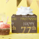 Este design de papel de embrulho apresenta uma mensagem como "FELIZ 77º ANIVERSÁRIO", com o "77º" a ter uma aparência falsa/imitação de ouro. Ele também apresenta um nome personalizado e um fundo castanho. Talvez possa ser utilizado quando se dá presentes para o setenta e sete anos de alguém. [~Z0000133]