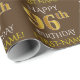 Este design de papel de embrulho apresenta uma mensagem como "FELIZ 96º ANIVERSÁRIO", com o "96º" a ter uma aparência falsa/imitação de ouro. Ele também apresenta um nome que pode ser personalizado, e um fundo castanho colorido. Talvez possa ser utilizada quando se dá presentes para o nonagésimo sexto aniversário de alguém. [~Z0000133]