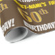 Este design de papel de embrulho apresenta uma mensagem como "PRIMEIRO NOME DO 60º ANIVERSÁRIO!", com o "60º" a ter uma aparência falsa/imitada de cor dourada, e com o nome e "ANIVERSÁRIO" numa fonte divertida e ousada. O nome é personalizável e o fundo é castanho colorido. Um papel de embrulho como este poderia talvez ser usado para embrulhar presentes de aniversário que são dados a alguém em comemoração do seu sexagésimo aniversário. [~Z0000211]