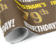 Este design de papel de empacotamento apresenta uma mensagem como "FIRSTNAME'S 79th BIRTHDAY!", com o "79º" a ter uma aparência de cor falsa/imitada em forma de ouro, e com o nome e "BIRTHDAY" numa fonte divertida e ousada. O nome é personalizável e o fundo é castanho colorido. Um papel de embrulho como este poderia talvez ser usado no embrulho de presentes de aniversário que são dados a alguém em comemoração de seus setenta e nono anos. [~Z0000211]