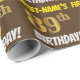 Este design de papel de embrulho apresenta uma mensagem como "FIRST-NAME'S 89th BIRTHDAY!", com o "89º" a ter uma aparência falsa/imitada de cor dourada, e com o nome e "BIRTHDAY" numa fonte divertida e ousada. O nome pode ser personalizado, e o fundo é castanho. Um papel de embrulho como este poderia talvez ser usado no embrulho de presentes de aniversário que são dados a alguém em comemoração do seu oitenta e nono aniversário. [~Z0000211]