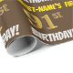 Este design de papel de embrulho apresenta uma mensagem como "PRIMEIRO NOME'S 91rua BIRTHDAY!", com a "91ruas" a ter uma aparência falsa/imitada de cor dourada, e com o nome e "BIRTHDAY" numa letra divertida e ousada. O nome pode ser personalizado e o fundo é castanho. Um papel de embrulho como este poderia talvez ser usado no embrulho de presentes de aniversário que estão sendo dados a alguém em comemoração de seus 90 anos de primeiro aniversário. [~Z0000211]