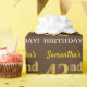 Este design de papel de embrulho apresenta uma mensagem como "Samantha's 42nd BIRTHDAY!", com o "42º" a ter uma aparência falsa/imitada de cor dourada. O nome pode ser personalizado, e o fundo é castanho. Talvez possa ser utilizada quando se dá presentes para o quadragésimo segundo aniversário de alguém. [~Z0000180]