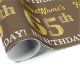 Este design de papel de embrulho apresenta uma mensagem como "FirstName’s 65th BIRTHDAY!", com o "65º" a ter uma aparência falsa/de cor dourada. O nome pode ser personalizado, e o fundo é castanho. Talvez possa ser utilizada quando se dá presentes para o sexagésimo quinto aniversário de alguém. [~Z0000180]