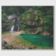 Fotografia paisagística de uma linda cascata de Virje na Eslovênia. A parte inferior da fotografia é uma água turquesa cristalina e transparente, com cores verdes e cama rochosa. Acima das rochas grandes há ascensão coberta de musgo verde. A cascata parece estar emergindo de cima dessas grandes rochas caindo e fluindo sobre elas. Acima dessas rochas e da floresta verde-cascata é ascensão.