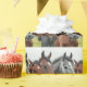 Três cavalos bonitos que estão em um pasto compo este design bonito da fotografia. Em cada extremidade um cavalo marrom com marcações brancas e no centro um cavalo cinzento com marcações brancas. Esta foto animal impressionante faz o design perfeito para amantes do animal e do cavalo.