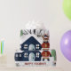 Cerveja de Natal, árvores e casa Felicidades natalícias Papel de embrulho de Natal que mostra um cervo vestido de inverno, árvores, uma casa, enfeites e presentes.