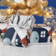 Cervo de inverno, árvores e casa Boas festas de Natal Papel de embrulho que mostra um cervo vestido de inverno, árvores, uma casa, enfeites e presentes.